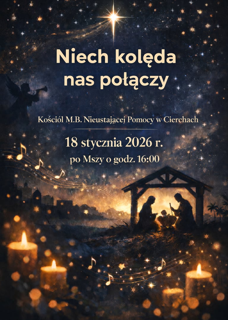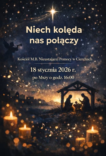 W sobotę 18 stycznia, po Mszy Świętej o godz. 16:00, serdecznie zapraszamy wszystkich Parafian oraz Gości na coroczny Koncert Kolęd i Pastorałek, który odbędzie się w naszym kościele.